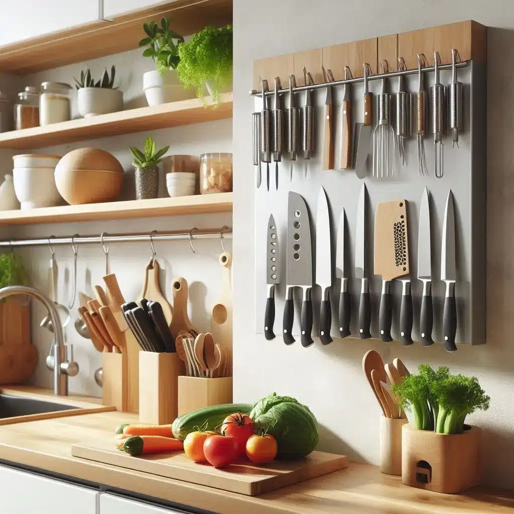 - Wall-mounted magnetic strips: Ideal for kitchens with limited countertop space. These strips are mounted on the wall, freeing up work surface space. The neodymium magnets embedded in the strip hold the knives securely and within easy reach. Additionally, they offer a decorative option that adds a modern touch to the kitchen.