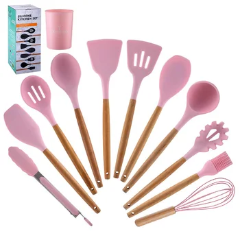 Pink Cooking Kitchenware Tool Silicone Utensils with Wooden Multifunction Handle Non-Stick Spatula Ladle Egg Beaters Shovel