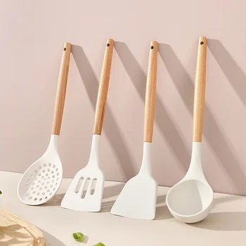 Kitchen UtensilsWhite Cooking Kitchenware Tool Silicone Utensils With Wooden Multifunction Handle Non-Stick Spatula Ladle Egg Beaters Shovel