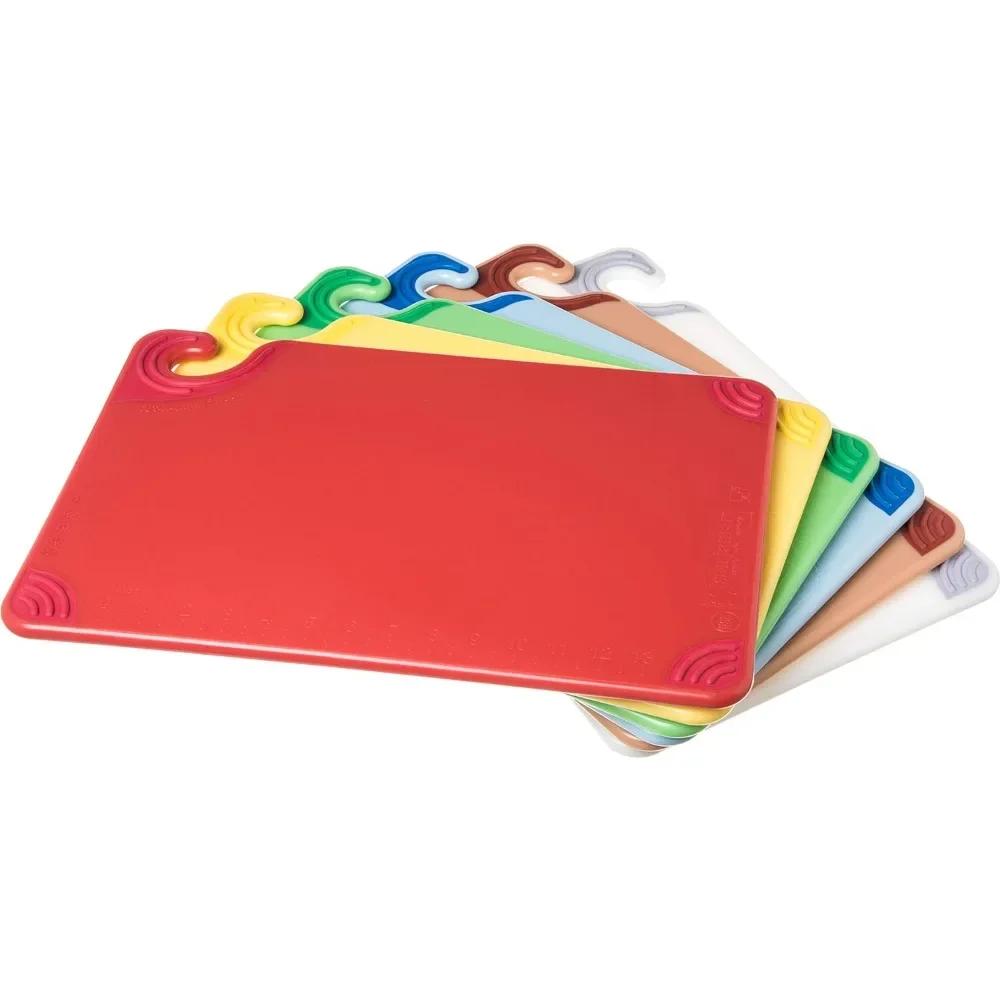 - Patented food safety hook provides sanitary transportation and allows board to securely hang when storing
